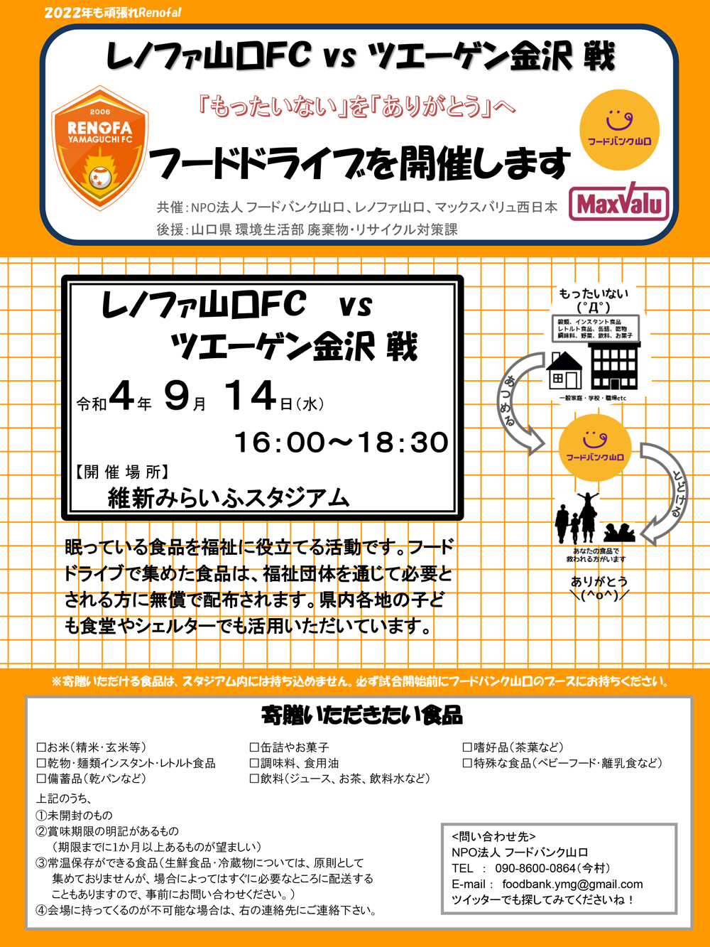 『フードドライブ』の実施 時間試合開始3時間前~試合開始30分前まで 場所場外正面 食料資源を有効に活用し、食品ロス削減につなげるため、ご家庭の余剰商品をお持ちいただき、フードバンク山口を通して山口県内のそれらを必要とする福祉施設や子ども食堂、団体などに寄附をいたします。 また、余剰食品を3個以上お持ちいただいた方には、レノファ山口オリジナルステッカーをプレゼントいたします。 たくさんのご協力をよろしくお願いいたします。 「フードドライブ」概要等、詳細はコチラ