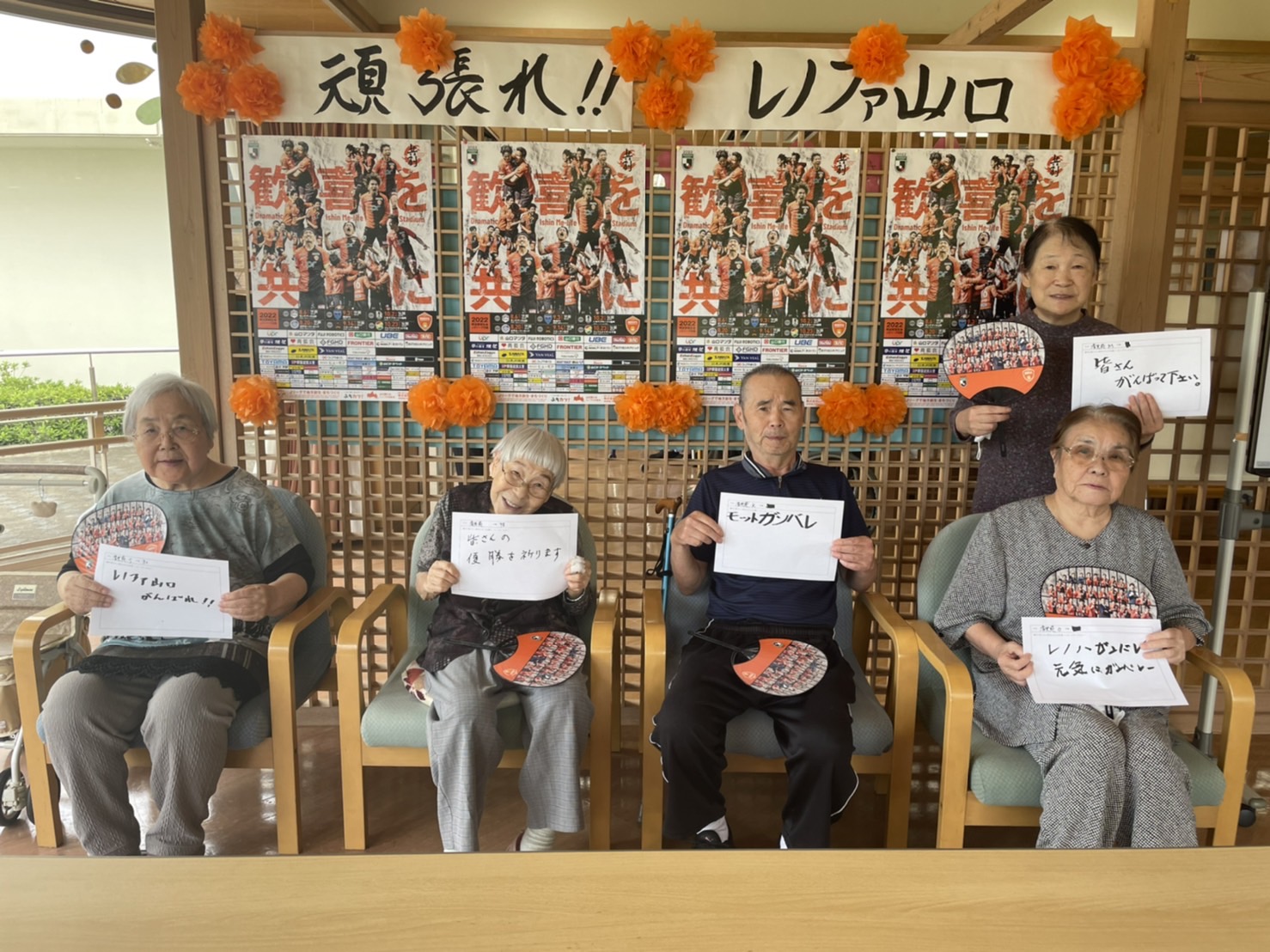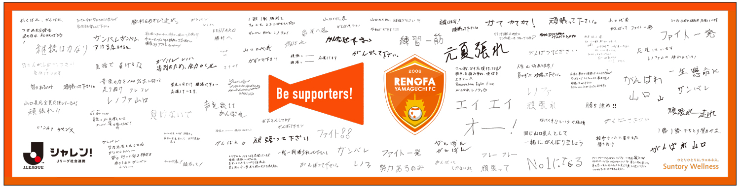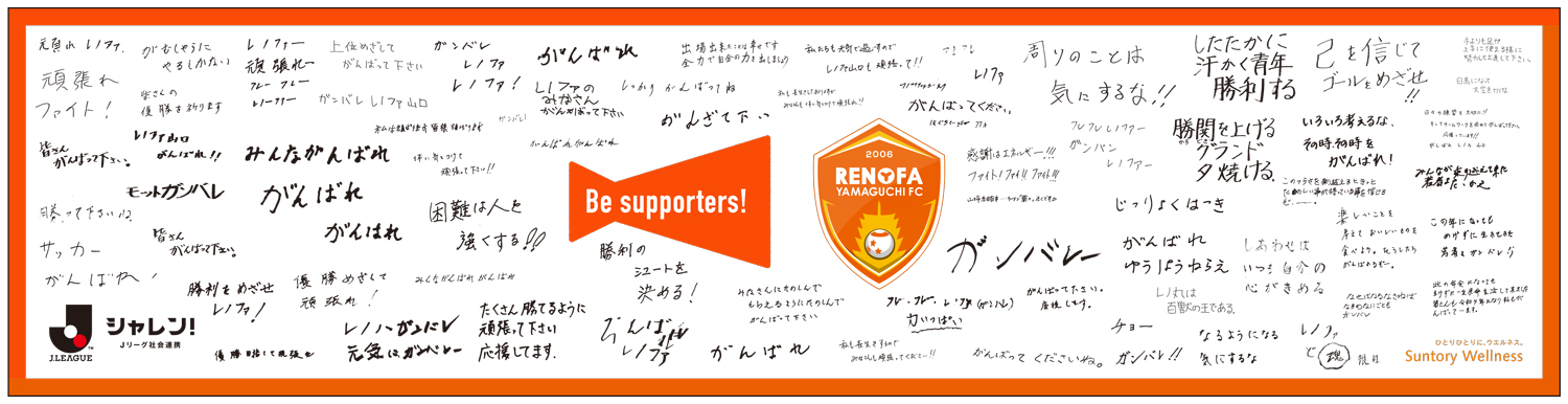 Be supporters! 人生の先輩からのエール企画 時間15:00~17:00頃 場所場外イベント広場 サントリーウエルネス株式会社と連携し、2020年から取り組んでいるBe supporters!の活動を紹介するブースです。 Be supporters! 今年は山口県内の高齢者施設で暮らす「人生の先輩」をはじめ地域の方からの応援メッセージを横断幕にする『人生の先輩からのエール企画』を実施。100以上のメッセージの入った横断幕を展示いたします。 また、17:54頃ピッチ内にて横断幕の贈呈式を行います。高齢者または施設職員が参加されます。