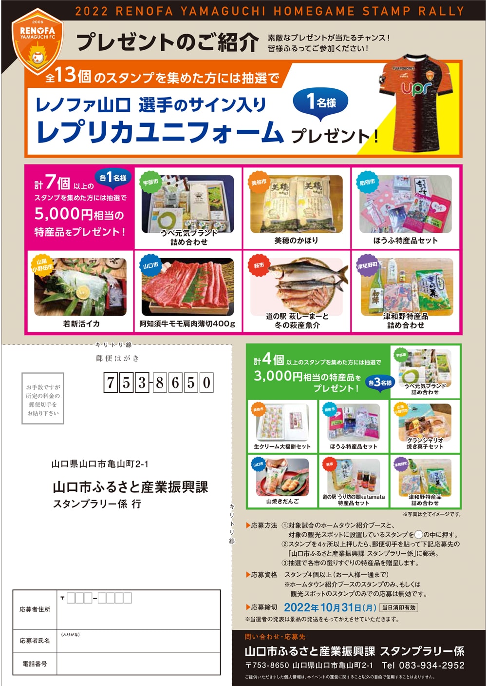 山口県央連携都市圏域(山口市・宇部市・防府市・山陽小野田市・美祢市・萩市・島根県津和野町)の取り組みとして、サンクスデーの特設ブースと各市町の観光施設に設置してあるスタンプを集めて応募すると抽選で特産品が当たります。