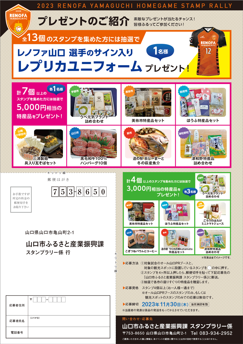 PRIDE OF 中四国抽選会開催! 時間 8:30~15:30 場所 各ゲート 今節のファジアーノ岡山戦はPRIDE OF 中四国対象試合! 岡山県・山口県のご提供により特産品があたる抽選会を実施いたします。 【応募方法】 各ゲートに設置されたQRコードを読み込みご応募ください。 ※ご応募にはJリーグIDが必要となります。 【応募期間】 10月22日(日) 8:30~23:59 【当選発表】 ご当選の方のみメールいたします。 ※商品は後日発送となります。 【賞品】 ・美豚ハムとフランクフルト3名様 ・カタログギフト「せせらぎ」 1名様 ・麹仕立て獺祭甘酒 1名様