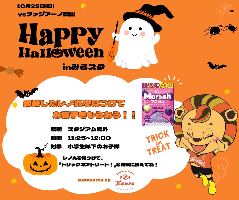 仮装したレノ丸を見つけて、お菓子をもらおう!supported by カンロ 時間 11:25〜12:00 場所 スタジアム場外 レノ丸がハロウィンの仮装をして登場! 小学生以下のお子様対象でレノ丸を見つけて「トリックオアトリート!」でお菓子プレゼント!