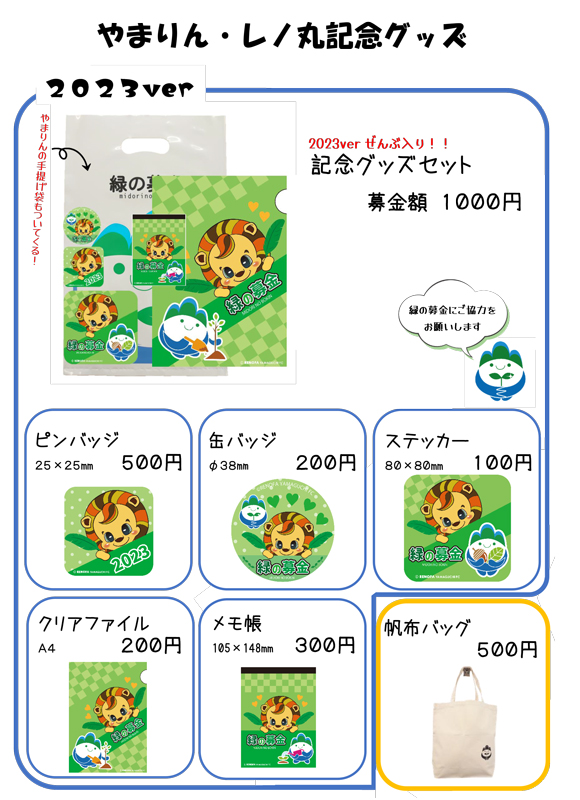 緑の募金活動 時間 9:00~12:00 場所 場外正面 緑の募金にご協力いただいた方に、やまりん・レノ丸コラボグッズ等を贈呈します。 その他に、緑の募金PRパネル展示や、緑の募金の活用内容や募金方法等について紹介します。