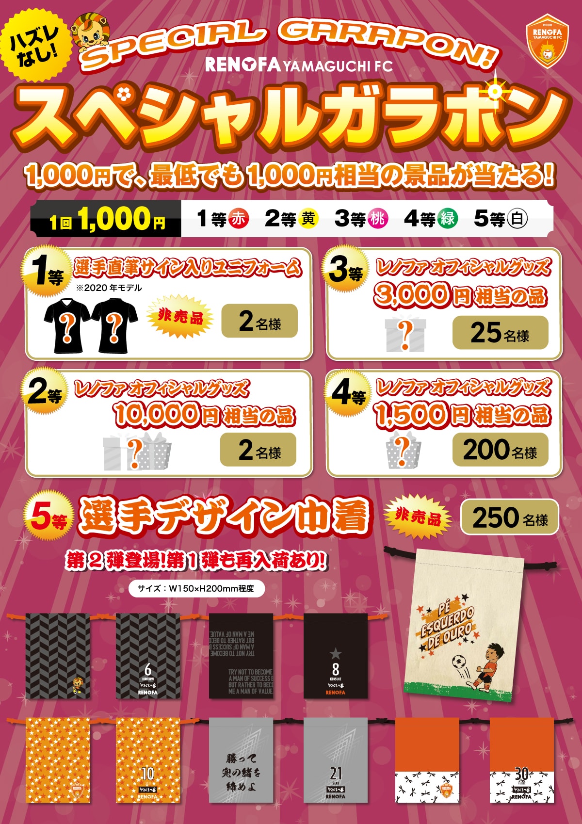今回もガラポン専用グッズ登場!最も当たる確率が高い5等には、選手モデルの『巾着』!