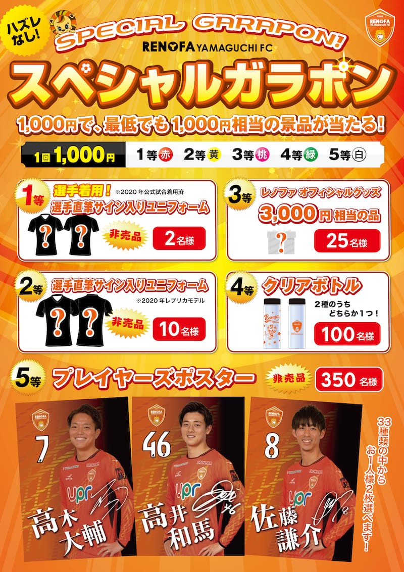 こちらの企画のみのスペシャルな非売品アイテムをご用意しました!今シーズンのレノファ選手のポスターです!33種類の中からお1人様2枚までお選びいただけます。