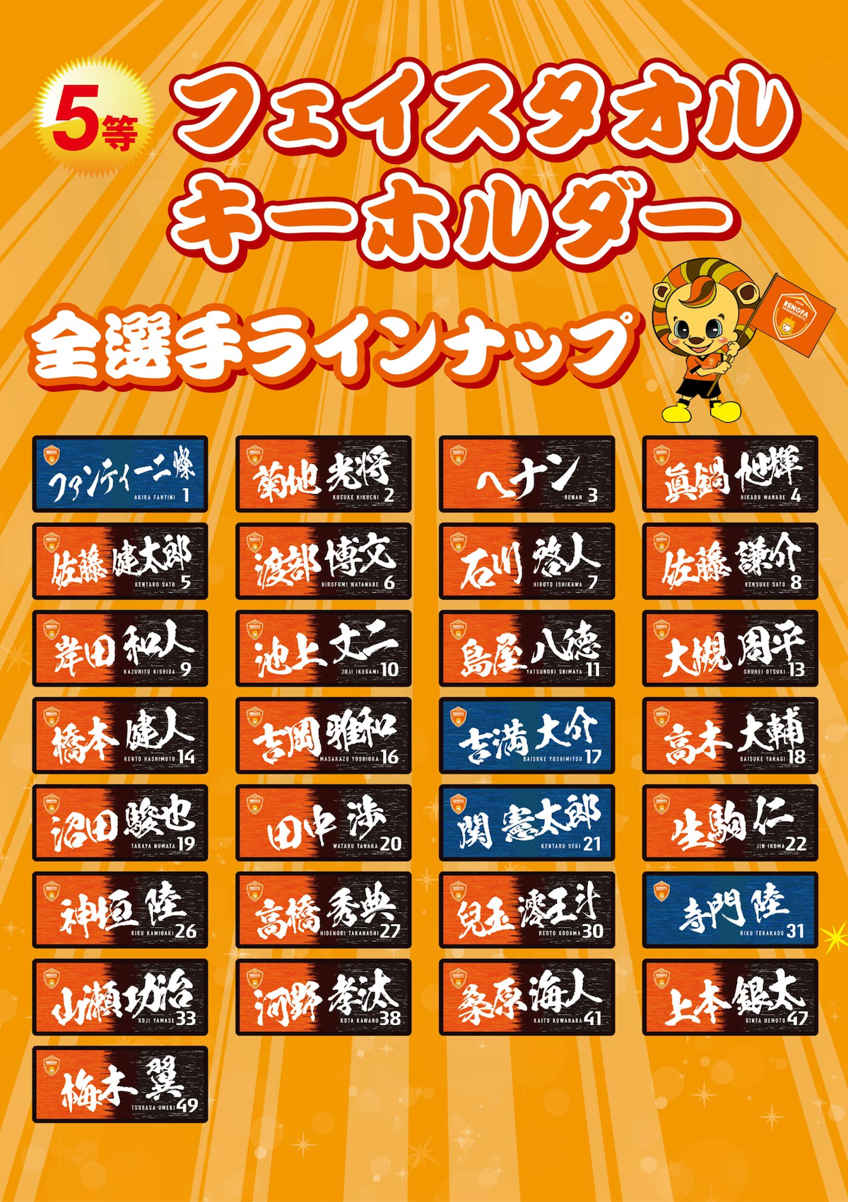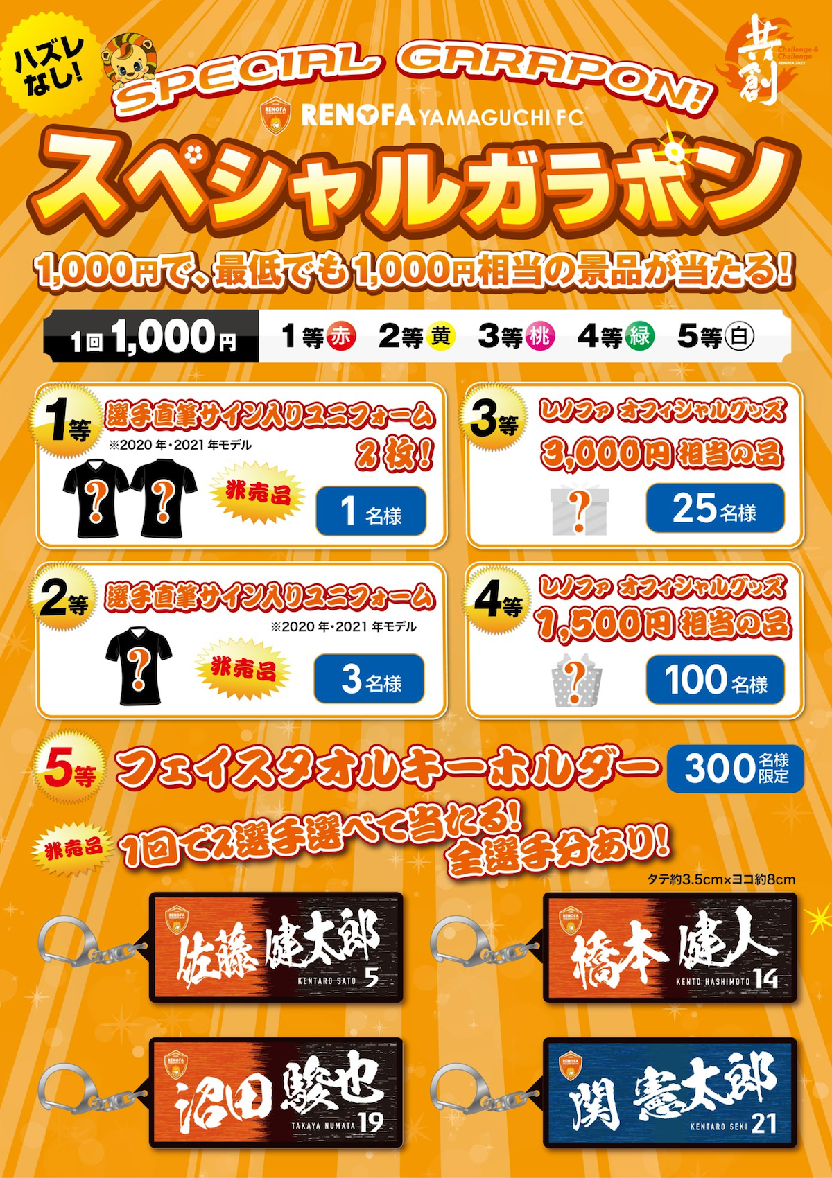 最も当たる確率が高い5等には、大人気応援グッズのフェイスタオルが今回特別にガラポン専用でキーホルダーとなって登場します。